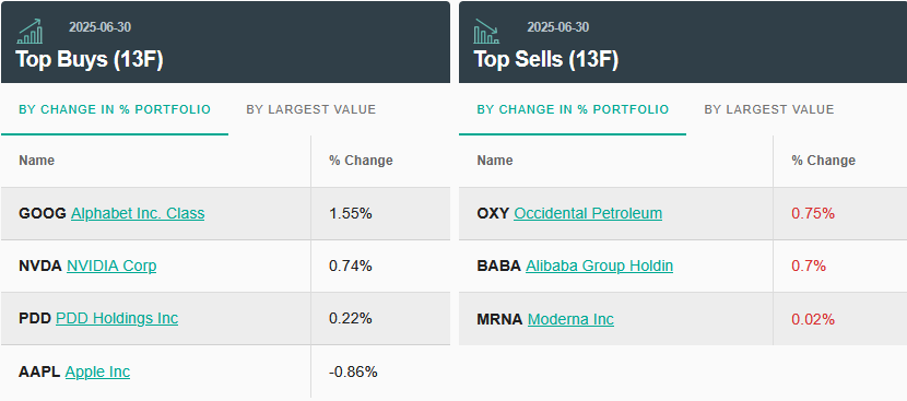 从持仓比例变化来看,前四大买入标的分别是:谷歌-C、英伟达、拼多多、苹果。