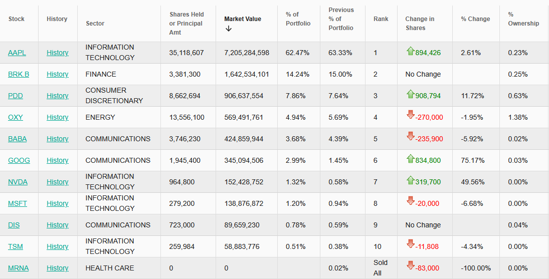 在前五大重仓股中,苹果(AAPL.US)仍位列第一,持仓约3512万股,持仓市值约为72.1亿美元,占投资组合比例为62.47%,持仓数量较上季度增加2.61%。